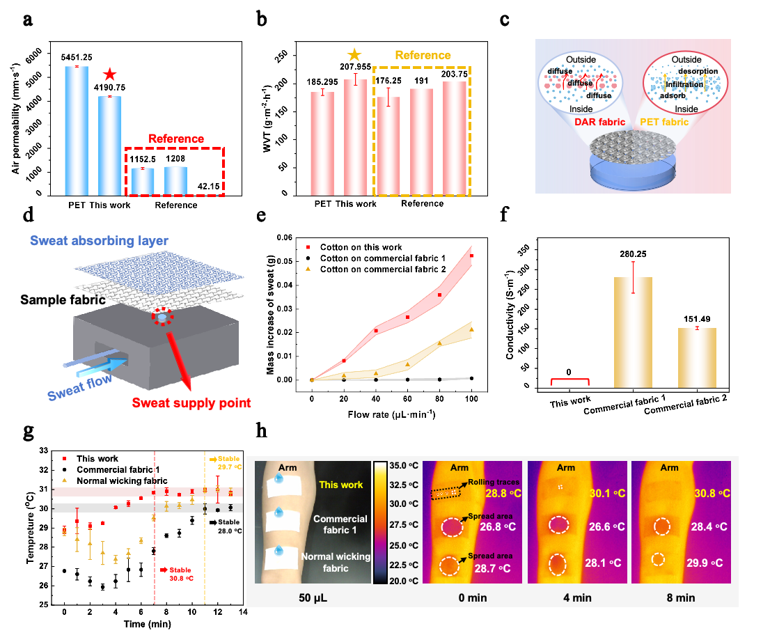 图5DAR织物的舒适性能。a)PET织物、DAR织物及相关文献的透气性对比。b)PET织物、DAR织物及相关文献的水蒸气透过率对比。c)DAR织物的透湿过程示意图。d)可控连续供水装置示意图。e)从皮肤侧传输至周围环境(棉)中的汗液质量随供汗速率的变化。f)经等量汗液运输-干燥后,DAR织物与商用织物的电导率对比。经等量汗液运输后,干燥过程中DAR织物与商用织物的g)温度随时间变化曲线和h)热红外图。