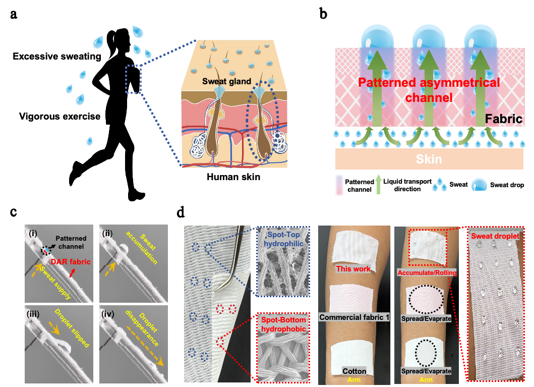 该研究受人体汗腺启发,成功开发出一种具有图案化不对称结构的“排汗织物”,使每个单独的汗液传输通道都具有物理和化学不对称性(孔径差异和局部渐变润湿性),使织物像皮肤一样通过“汗腺”通道将汗液反重力定向输送至织物外表面并聚集成汗滴,随人体摆动可轻松滑落(滚动角约45°)。该排汗织物的单向导水速率高达12.2 mL·cm-2·min-1,远超人体出汗速度,实现了可持续的汗液管理。为伤口护理,生物流体监测和微流体控制的先进纤维材料的开发提供了有效策略。论文第一作者为朱豆豆博士,四虎