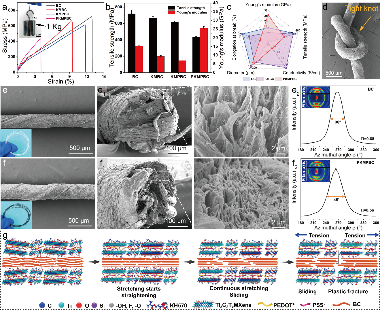 图3:PKMPBC纤维的取向结构与力学性能。
