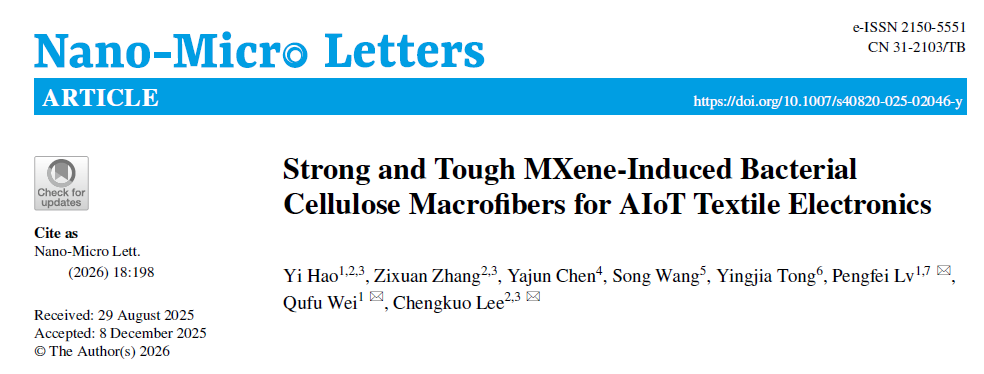 魏取福教授和吕鹏飞研究员团队联合新加坡国立大学Chengkuo Lee教授团队在期刊《Nano-Micro Letters》上发表了研究论文“Strong and Tough MXene-Induced Bacterial Cellulose Macrofibers for AIoT Textile Electronics”。研究通过构建K-MXene/PEDOT:PSS导电墨水-取向细菌纤维素(BC)纤维结构,实现了兼具超强韧与耐液体的导电纤维(PKMPBC)。该纤维在空气中电导率达到10.05 S cm-1,在去离子水中仍可保持7.80 S cm-1的电导率;纤维具备433.8 MPa的拉伸强度和25.9 GPa的杨氏模量,并展现出优异且持久的疏水性与可生物降解性。