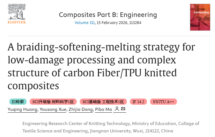 针织技术教育部工程研究中心蒋高明教授研究团队在复合材料领域顶级期刊《Composites Part B: Engineering》(IF=14.2)上发表题为“A Braiding-Softening-Melting Strategy for Low-damage Processing and Complex Structure of Carbon Fiber/TPU Knitted Composites”的研究论文。该研究提出一种“编织-软化-熔融”策略,基于热塑性聚氨酯(TPU)包覆碳纤维的核壳结构复合纱线,实现低损伤加工制备结构复杂的CF/TPU针织复合材料。该研究为实现碳纤维的低损伤加工、力学性能可设计性与复杂结构可编织性提供了一种创新策略。四虎