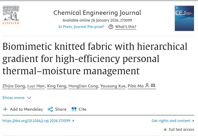 马丕波教授和董智佳副教授团队在期刊《Chemical Engineering Journal》上,发表了最新研究成果“Biomimetic knitted fabric with hierarchical gradient for high-efficiency personal thermal–moisture management”。