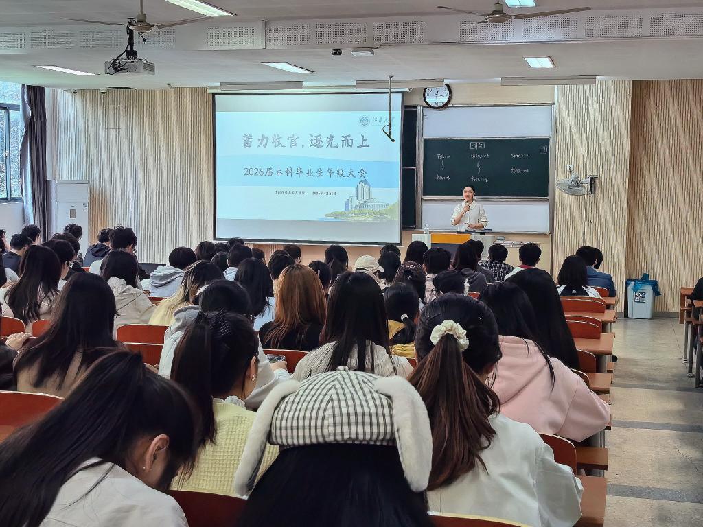 2026届本科毕业生“蓄力收官,逐光而上”主题年级大会于第一教学楼1B103召开,2022级本科生辅导员伏曦及全体本科应届毕业生参会。