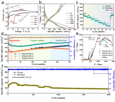 图2:纺锤链状FO@NCNFs复合纳米纤维应用于锂离子电池的电化学性能。