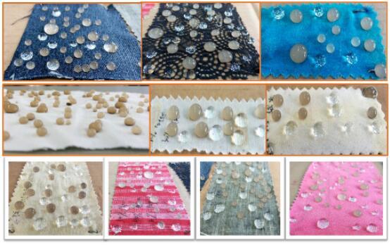 针对日益提高的防水面料的需求,张教授团队将仿生学原理与纳米技术相结合,从材料界面功能化的角度入手,开发了一类应用广泛,操作简单,绿色环保的新型绿色纳米界面材料。该类超疏水材料(不含氟元素)通过喷涂方式可在多种材料表面形成稳定的防水、防油、防污的三防纳米涂层,尤其在纤维材料的表面可形成具有优良仿生效果的多级微纳结构,从而有效地隔绝水、油以及灰尘的污染,构建物理抗菌屏蔽层,在保证纤维材料透气性与柔软度的同时,减少了材料本身的污染以及洗涤过程带来的水资源消耗与二次污染。目前市面上应用最广泛的三防类产品是有机含氟化合物,其生产过程及产品中的副产物全氟辛酸及其盐类(PFOA)和全氟辛烷磺酸(PFOS)具有潜在的致癌性,在防水纺织品整理过程中和整理后会释放含氟化合物,危害人体和环境。多年来张丹教授团队致力于发展新型的无氟双疏绿色产品,不含任何氟元素且具有优异的拒水自清洁性,具备较强的抗污渍能力和防油性能,有望替代传统含氟拒水整理剂。目前,张丹教授团队已经针对诸如棉、麻、聚酯、丝、皮革等多种不同材质的纤维面料以及木材、塑料、金属、建材、玻璃等多类材质上进行了水、油、泥浆、灰尘等多种生产生活中常见污染物的实验,并取得了十分显著的成果。本产品在不改变材料本身外观、透气性与柔性的前提下,对于多种常见纺织品污染物均具有良好的自清洁作用,其效果照片请见下图: