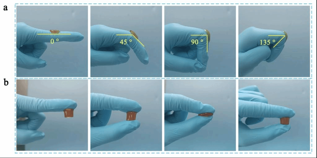 该水凝胶敷料还有非常强的变形能力,能够随着手指或机体的变形而发声形变。在挤压之后也能恢复到初始状态。