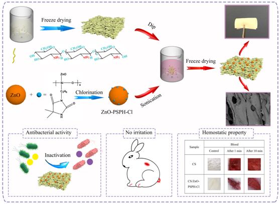 任学宏教授团队在国际期刊ACS Applied Materials & Interfaces上发表了题目为“Novel ZnO/N-halamine-Mediated Multifunctional Dressings as Quick Antibacterial Agent for Biomedical Applications”的学术论文(ACS Applied Materials & Interfaces,2019,11,31411, IF 8.456)。用于皮肤伤口的功能敷料需要避免体液和蛋白质伤口表面渗出,控制血液流失,及防止细菌交叉感染。基于目前大部分敷料止血性能差、抗菌效率低、细菌耐药性问题,该研究首次将抗菌剂卤胺化合物与生物活性纳米氧化锌结合,通过超声辅助冷冻干燥工艺,制备得到三维多孔网络结构的卤胺/氧化锌/壳聚糖杂化材料。基于不同组分的协同作用,该复合材料表现出了优异的止血性能、血小板粘附性能、液体吸附性能、高效抗菌性能及良好的生物相容性。此外,进一步探究了该敷料对兔子完整及破损表皮皮肤的刺激性,实验结果表明,设计的抗菌止血材料安全无皮肤刺激性。