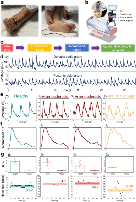 糖尿病是一种机体产生的胰岛素不足或对胰岛素反应异常,导致血糖(葡萄糖)水平异常高的慢性疾病。糖尿病并发症种类繁多,其中糖尿病足溃疡(DFUs)和外周血管疾病(PVDs)最为常见。糖尿病患者面临着终生发展为DFU的风险高达25%,且这些并发症常与室性心脏病等心血管疾病相伴,成为糖尿病患者发病和死亡的主要原因。为了降低与这些风险相关的危害,及时评估患者的血管健康状况并实施有效干预已成为亟待解决的问题。目前已有分别解决心血管疾病诊断和溃疡创面治疗的研究报道和相关转化应用,但集成PVDs的诊断与DFUs的治疗功能的生物材料与器件并不多见。