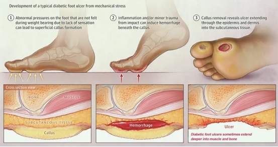 图1 糖尿病足溃疡的形成过程(机械应力和缺血性)(图片版权:JAMA©2024美国医学会)