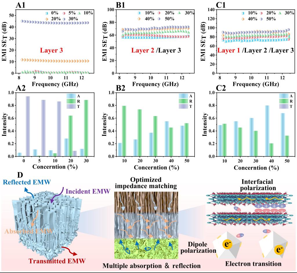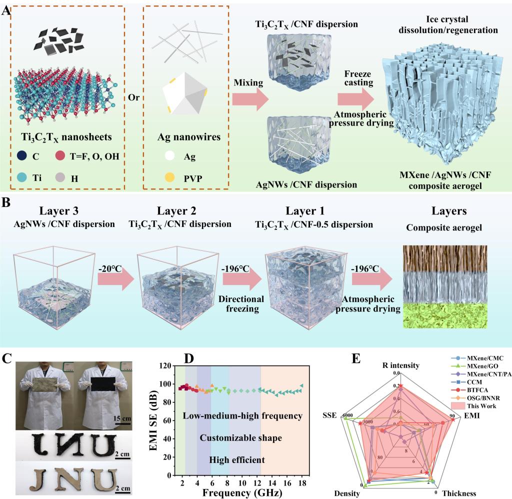 随着智能物联网设备和第五代移动通信技术的蓬勃发展,多频电磁干扰(EMI)及其相关电磁污染受到了广泛关注。传统的高导电性EMI屏蔽材料虽然能有效阻挡电磁波(EMW),但容易造成二次电磁污染。因此,开发具有高屏蔽效率和低反射系数(R)的EMI屏蔽材料仍是一个关键挑战。近年来,轻质、高孔隙率的气凝胶材料,被认为是解决高反射EMI屏蔽问题的理想方案。然而,传统的冷冻干燥工艺制备的气凝胶通常具有无序结构,其EMI屏蔽性能通常与电导率相关,并且由于均匀导电网络与空气界面之间的阻抗失配,无序气凝胶往往导致EMW的强烈反射,并且R系数随着EMI屏蔽性能的增强而显著增加,并不能降低二次电磁污染。