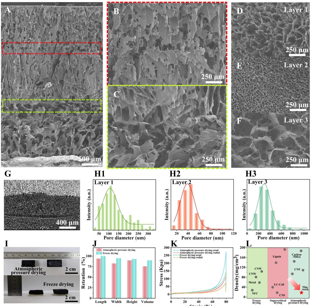 付少海教授团队在ADVANCED FUNCTIONAL MATERIALS期刊上发表了一篇题为 “Atmospheric pressure dried discontinuous pore gradient structured CNF-based aerogel for ultra-low reflection, broadband, and super-high EMI shielding”的研究成果。该研究基于溶剂交换后的常压干燥策略,制备了一种具有非连续孔隙梯度结构的大面积多层复合纤维素基气凝胶(CNA),实现了宽带电磁波段(L,S,C,X,Ku)下的超高电磁干扰屏蔽性能(> 90 dB)和超低的反射系数(R≈0.2),并且通过太阳能驱动实现了对溶剂交换过程中产生的有机溶剂进行选择性回收,为常压干燥制备大面积纤维素基气凝胶以及超低反射EMI屏蔽应用提供了新的思路和途径。