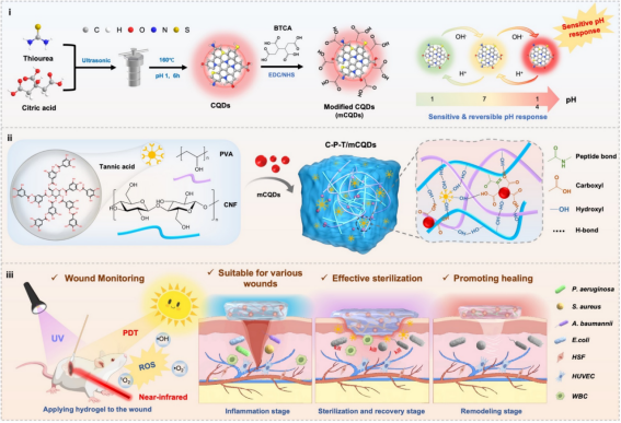 图1.(i)mCQDs和(ii)可涂抹水凝胶的合成示意图;(iii)具有PDT作用的pH响应水凝胶在监测伤口愈合中的应用示意图
