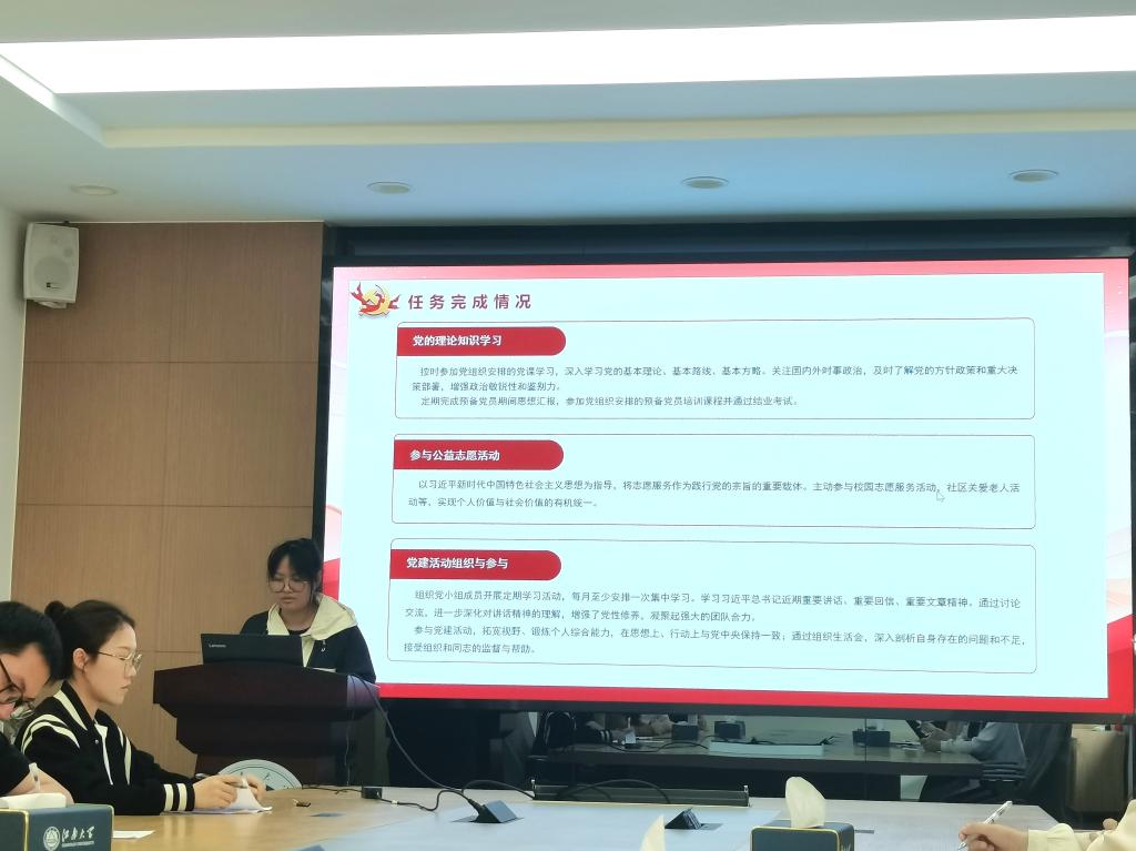 特邀党建组织员沈波,组织员张志新,辅导员孙慧,纺织本科生党支部书记孙婷婷以及2025年上半年8名拟转正预备党员参加答辩会。