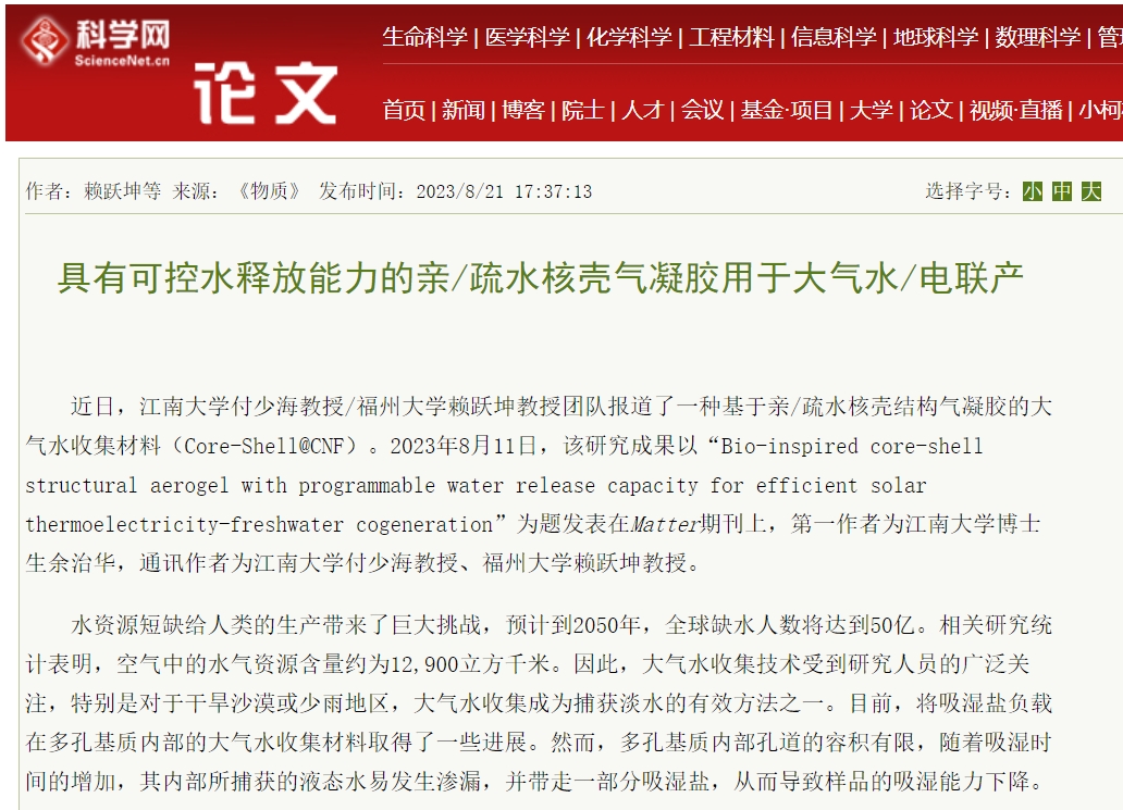 “长风破浪会有时,直挂云帆济沧海。”科研路上余治华砥志研思,求真务实,他的研究成果大幅提升了大气集水材料的使用寿命。他对纤维素气凝胶设计了一种核壳润湿性梯度结构,从根源上解决了吸湿盐泄漏带来的安全隐患。“想做一些新的东西,具有实际价值的东西”,正是朝着这样的目标方向,他从实际出发,推动了大气集水材料的创新发展和安全问题的有效解决。靡不有初,鲜克有终。余治华坚信无论做什么,只要始终保持着最开始时饱满的激情和状态就一定会成功,他也始终牢记自己走上科研道路的初心,秉持着对自然真理的追寻热爱和经世致用的使命担当,他坚持不懈地攻克了一个又一个科研难关,他的最新成果发表在Cell的子刊Matter上,该项成果被《科技日报》、《科学网》等主流媒体重点报道,科研成果若继续进行工业化探索,有望缓解干旱少雨地区的缺水问题。