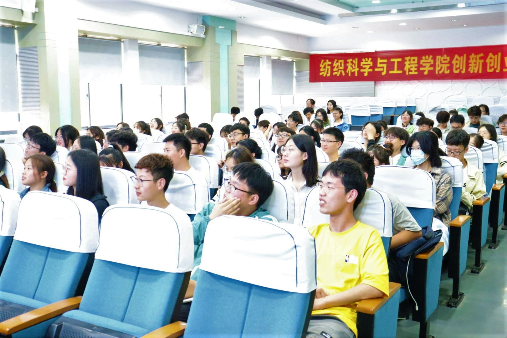 讲座完毕,马丕波教授与在场的同学们进行了互动讨论,对同学们关于做科研所需的学历程度、学科交叉所需的准备等问题做了详细的回复,鼓励同学们多多跨学科了解知识,提高专业技能,勉励同学们纺出未来,织出彩虹,为未来的中国纺织工业储备力量。