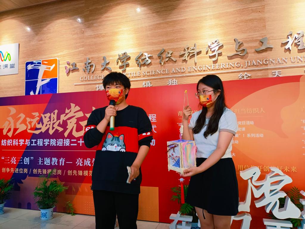 本次“青春芳华”创意扎染设计大赛2.0以“织青春锦绣,染飞彩流年”为创作主题。各参赛队围绕“青春心向党”、“风景旧曾谙”、“国风万古存”三个方向,使用统一分发的材料,运用不同的扎染手法,结合自己的灵感创意与生活体验,分别在布料上对爱党爱国、江南好风景以及传统文化的传承这三方面进行创作。参赛队运用染好的布料对一些常见的物品进行装饰,通过体验传统染整工艺技术的魅力以及通过设计、装饰来将传统工艺与普通物品相结合,从而碰撞出一场震撼人心的视觉盛宴。“大橘今天吃包子了吗队”用淡紫色渲染出凌霜傲然的不败秋花,辅以装饰,最终绽放于小巧玲珑的灯笼之上;“啊对对对队”用鲜艳的色彩,染出了关于女娲补天的内容创作,表达出对国潮兴起、国风永存的展望;“干什么都队”用一颗爱国爱党的赤诚之心装饰出一面风筝,寓意放飞理想向未来;“三元一次方程组队”以黛紫、官黄相互结合,染出独具韵味的江南春色;“你说的都对队”以孔雀石绿、玫红、明黄为主题色创作,将染布呈现于笔帘之上,体现出一种自然融合的美感;“你说的都对plus队”依托于繁星密布的浩渺星空,并与团扇有机结合,诠释出无限遐想的中国传统之美。这些优秀参赛作品传递出江南学子爱党爱国爱校的深厚情怀,展现了纺织青年敢于创新的精神风貌,丰富了同学们的课余文化生活,提高了青年学子的艺术审美修养和艺术表现才能。