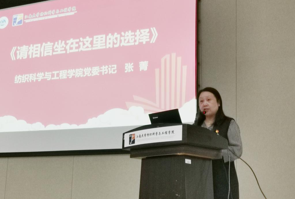学院党委书记张菁致欢迎辞,张书记首先代表学院全体师生对284名新同学加入纺院大家庭表示欢迎。张书记就如何在大学阶段最大可能地去实现人生价值,彰显生命意义,给同学们提出了三点建议:第一、装一份“心怀家国”的胸襟情怀。只有把个人抱负融入伟大事业,人生才会开启一个新的高度,也才能更有条件完成人生价值的进阶;第二、养一种“久久为功”的平和心态。希望同学们做久久为功的努力,从现在做起、小事做起、细节做起,踏踏实实的你,终将变得了不起;第三、定一个“相信未来”的人生目标。每个人都是自己人生的导演,是精彩绚烂还是平凡黯淡,全看你怎么选择,请相信坐在这里的选择,相信未来,只要方向足够明确,信念足够坚定,全世界都会为你让路。
