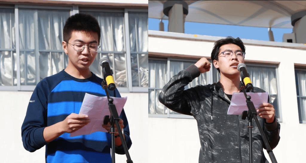 运动员代表、纺织1804班关荣与裁判员代表邹敏发言