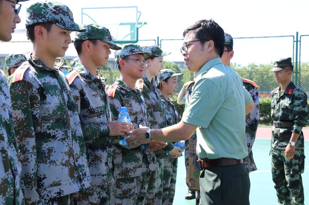 8月28日上午,纺织服装学院党委副书记周云龙在带训辅导员吴丹的陪同下来到训练场慰问军训参训学生以及承训教官。