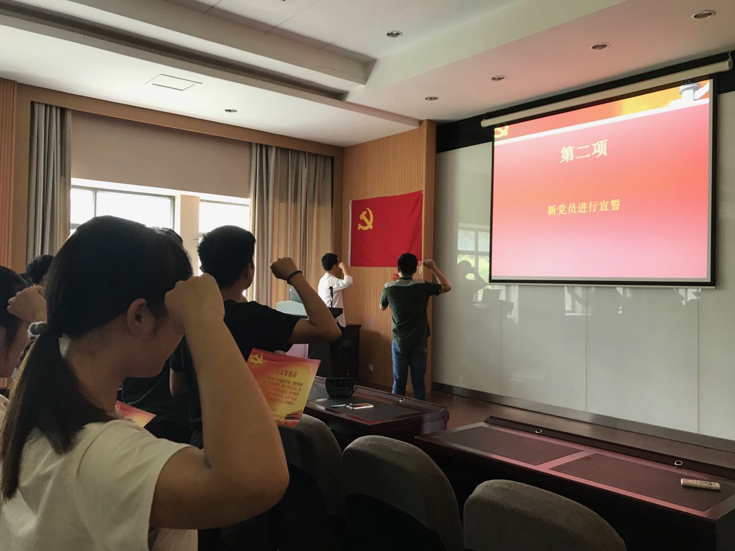 宣誓仪式第一项,全体师生起立,奏唱庄严的《国际歌》。随后,21名新党员面朝党旗,在学院辅导员陈裕老师的带领下宣读入党誓词。党员们用铿锵有力的声音宣读了庄严的入党誓词,表明了自己对党的赤诚忠心和坚定决心。