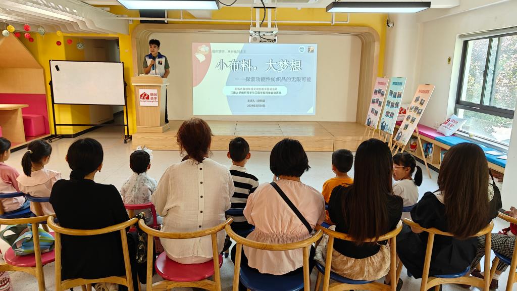 主讲人赵勃涵通过生活中的实例,从衣服布料讲到上天入海的大国重器,让儿童了解到这些常见物品背后的纺织科学知识。他的精彩讲述激发起孩子们的好奇心,让他们用知识的力量和实践的勇气去大胆探索未知领域、编织属于自己的梦想。这样的课堂,不仅让孩子们学到了纺织相关科学知识,更重要的是,激发了他们探索思考生活知识的浓厚兴趣,培养了他们学以致用报效祖国的家国情怀。