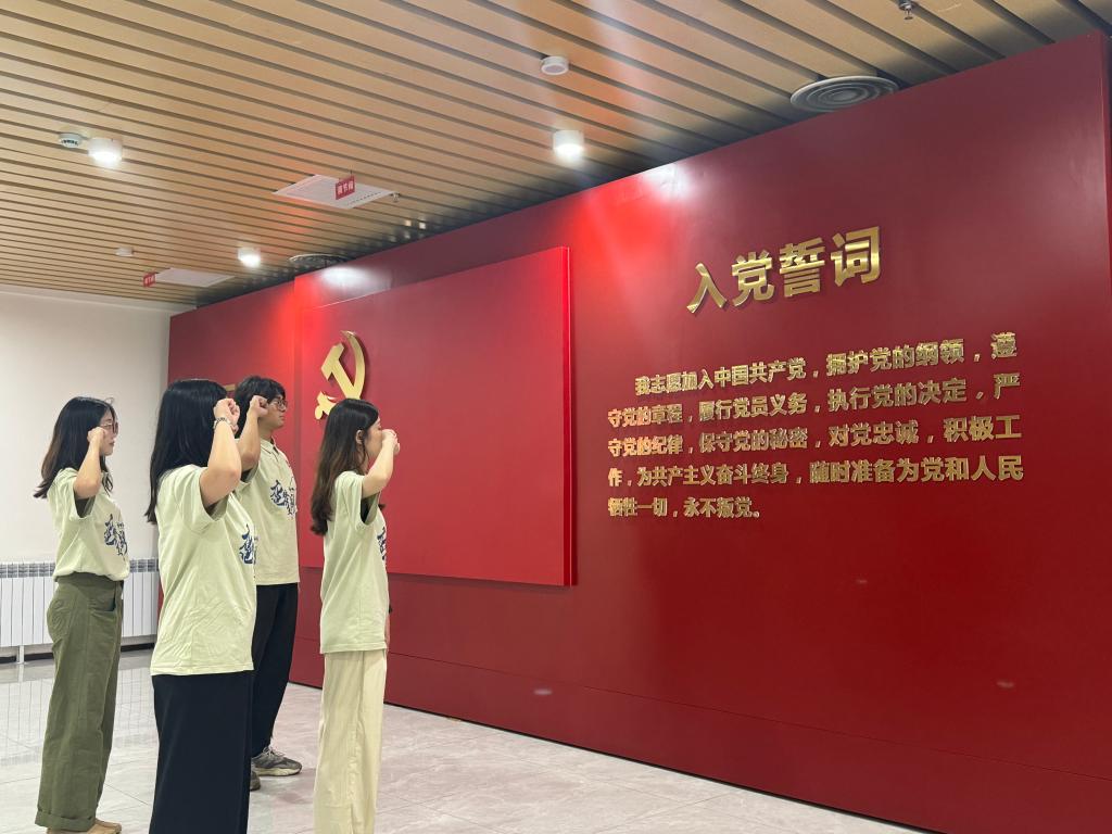 “鼋梦丝路”纺织援疆团成员在八路军驻新疆办事处重温入党誓词