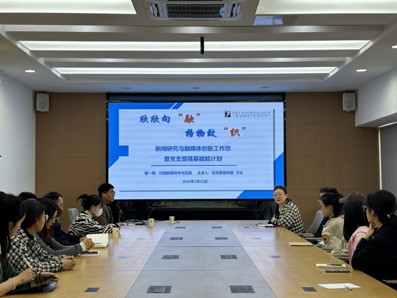 在A306会议室举办“欣欣向‘融’,格物致‘织’ ”新闻研究与融媒体创新工作坊第一期,校党委宣传部于乐老师受邀作专题培训。学院师生党支部宣传委员,学生会、研究生会各部门宣传骨干参与了本次培训,培训由学工办副主任任学敏主持。