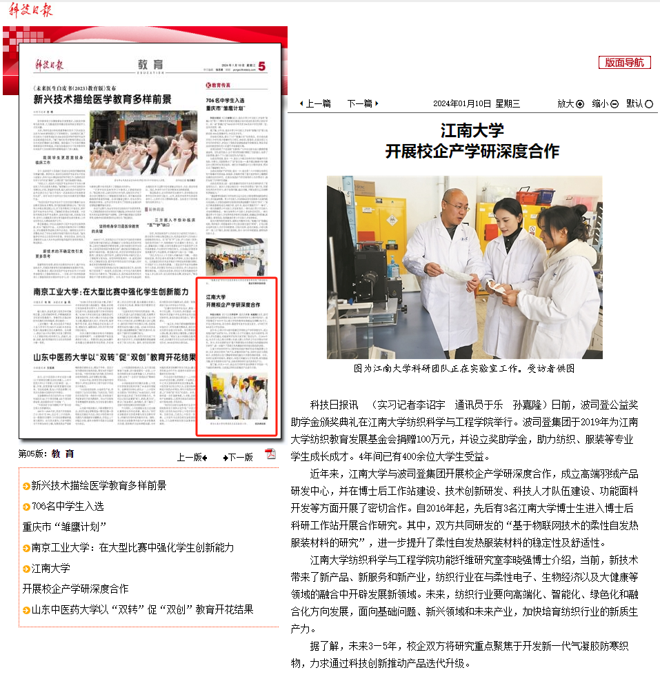 与波司登集团开展校企产学研深度合作,成立高端羽绒产品研发中心,并在博士后工作站建设、技术创新研发、科技人才队伍建设、功能面料开发等方面开展了密切合作。自2016年起,先后有3名四虎