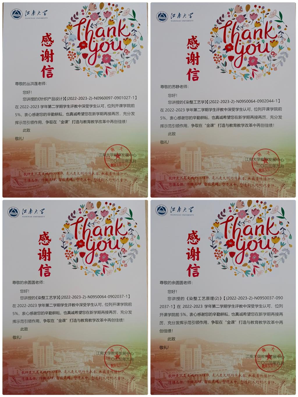 丛洪莲、苏静、余圆圆三位老师收到学校教师发展中心的感谢信,在2022-2023学年第二学期学生评教中,他们分别讲授的《针织产品设计》《染整工艺学》《染整工艺学》《染整工艺原理(2)》课程深受学生认可,位列学院前5%。学校向他们的辛勤耕耘表示感谢,并希望他们充分发挥示范引领作用,在教育教学改革中再创佳绩。