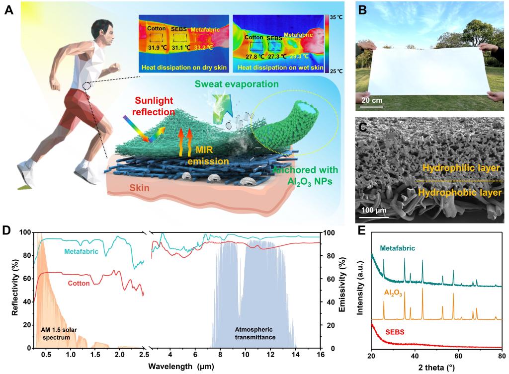 作者采用大规模静电纺丝和偶联辅助浸涂技术构建了分层结构超织物。具体来说,该超织物由疏水性的Styrene-ethylene-butylene-styrene(SEBS)非织造布内层与亲水性的SEBS/PPO-PEO-PPO (F127)/Al2O3复合材料外层组成,将Janus润湿性和蒸发散热集成到被动辐射冷却系统中。我们通过将F127与高折射率(n≈1.8)的Al2O3光散射体集成,合理调节并增强了超织物的太阳反射率至≈92%,大气窗口热发射率达到≈97%。