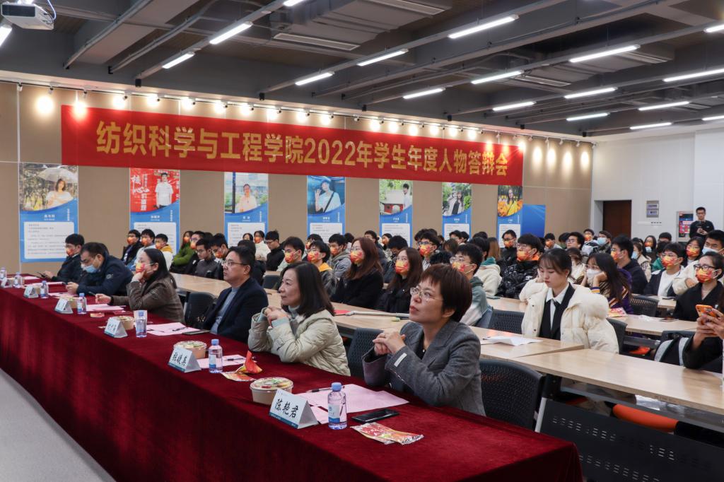 2022年学生年度人物提名奖”的吴与同、张欣、王成成、黄夏妍、郭琛龙、徐涛、韩璐怡、赵薇、纺织1902班、学风促进中心等同学、集体颁发奖杯和荣誉证书。