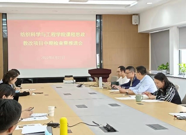 2022年4月27日下午,纺织学院通过线上线下结合的形式召开了院级课程思政中期检查暨工作推进会。全体院领导、系主任、教改项目负责人参加了会议。会议由副院长黄锋林主持。