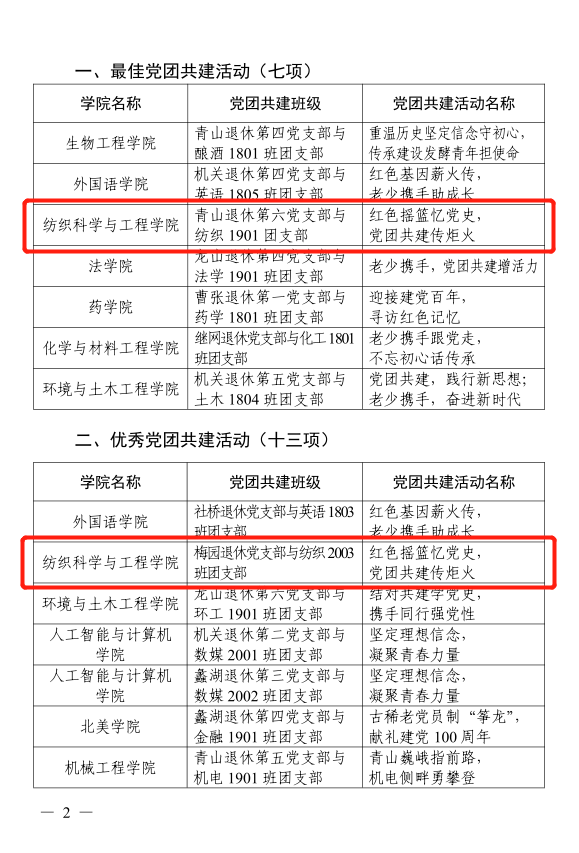 报送的两项活动均获表彰。其中青山退休第六党支部与纺织1901团支部组织申报的活动荣获“最佳党团共建活动”(全校共七项),梅园退休党支部与纺织2003班团支部组织申报的活动荣获“优秀党团共建活动”。