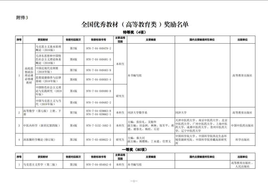 据悉,全国教材建设奖是教材领域的最高奖,由国家教材委员会主办、教育部承办,是检阅、展示教材建设服务党和国家人才培养成果,增强教材工作者荣誉感、责任感,推动构建中国特色、世界水平教材体系的一项重大制度。此次表彰的全国优秀教材高等教育类共399种,其中一等奖80项。