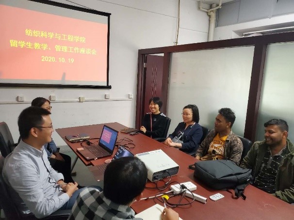 的留学生教学、管理工作座谈会在纺织学院举行。纺织学院副院长黄锋林、刘庆生,纺织工程系系主任傅佳佳,留学生班主任柯莹、徐荷澜、崔鹏,以及在校留学生代表卡萨那和萨拉查参加了座谈会
