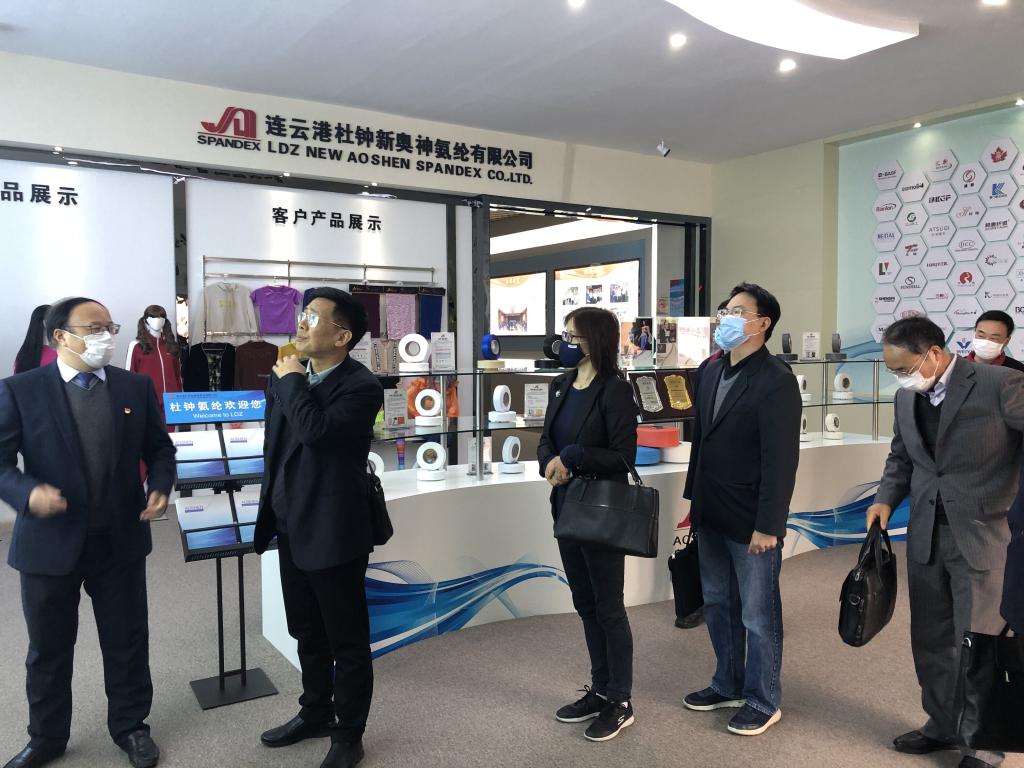 首先蒋教授一行参观了连云港杜钟新奥神氨纶有限公司展厅、生产线、研发中心,对低温热粘合氨纶、抗菌氨纶、驱蚊氨纶及氨纶生产全流程自动化、智能化生产线等高度评价。
