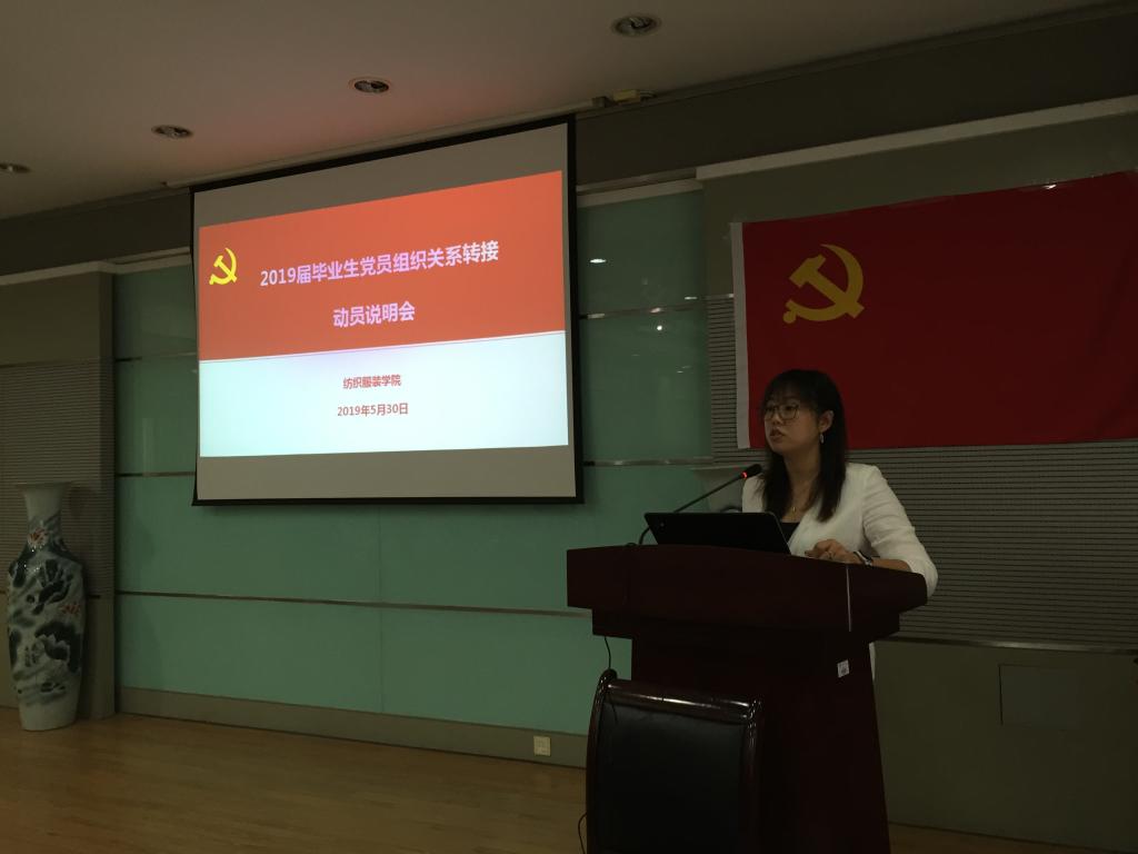 为做好毕业生党员组织关系转接工作,增强毕业生党员党性观念和组织观念,5月30日下午,纺织服装学院在学院A103会议室举办毕业生党员组织关系转接动员说明会暨党员党性教育活动。本次会议由学院学生党建负责辅导员吴丹老师主持,学院党委秘书李慧晓杉,研究生辅导员徐雅静,2015级本科生辅导员陈裕及全体毕业生党员参加会议及活动。