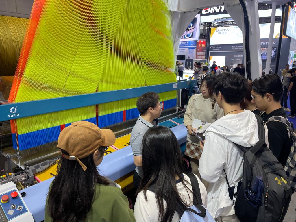 参观过程中,同学们认真感受每一台机器所讲述的纺织工业创新故事,并与专业课老师、参展商代表进行深入探讨,收获颇丰。同学们在多元展区中穿梭,近距离观察纺纱、织造、染整等多个纺织核心生产环节涉及的先进设备,了解化纤、染化料、墨水等新型原材料,体会产业链一站式高效对接、协同发展的磅礴力量;了解智能纺机设备创新升级新成果,感受智能化引领强大优势;学习融合人工智能AI互联、大数据等前沿科技呈现出的新技术、新应用,全方位领略创新驱动的发展趋势。在创新浪潮席卷全球的当下,此次参观不仅是一次学习之旅,更是激发学生创新思维的契机。同学们接触了专业前沿,了解到全球纺织行业向智能化、绿色化、融合化不断迈进的趋势,从而开阔全新视野,激发对未来纺织科技的兴趣与热情。