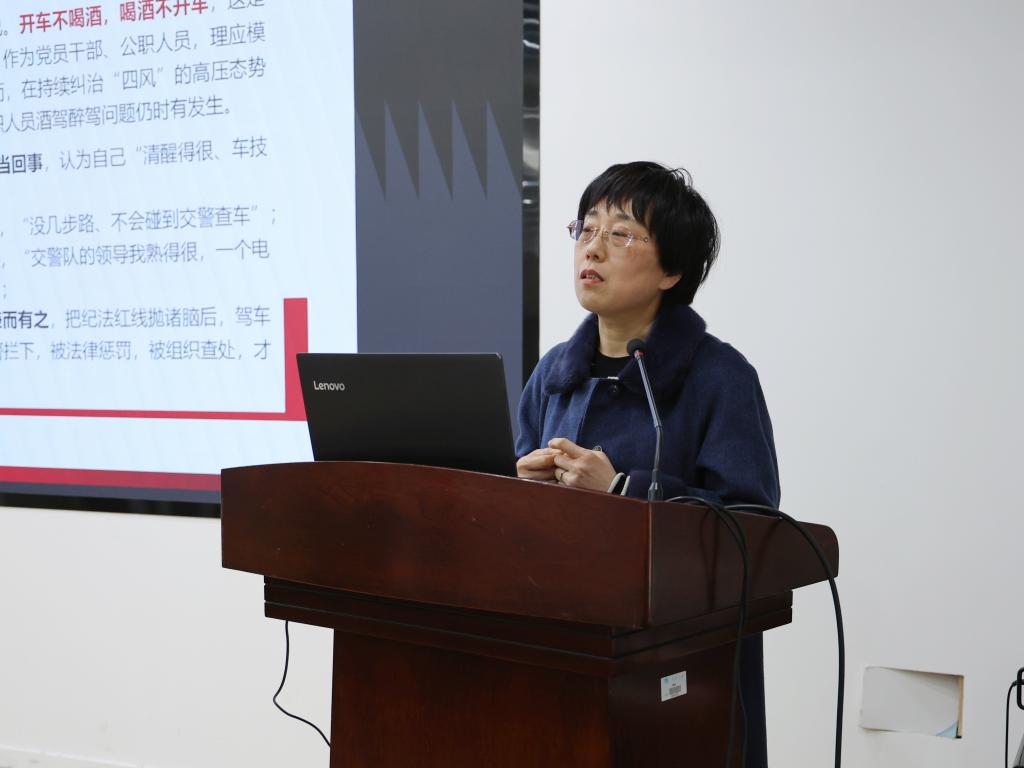 张菁燕首先以《“身边的警示”系列教育一:时刻绷紧纪律弦莫让酒驾毁前程》为题作警示教育。她从典型案例出发,对酒驾醉驾进行了详细的纪法分析,告诫全体教职工要深刻认识遵守党纪国法的必要性、深刻领会“严管就是厚爱”的重要意义、深刻理解酒驾醉驾产生的严重危害,倡议全体教职工在工作、生活各方面坚决做到严守底线、不踩“红线”、不碰“高压线”,自觉维护党员干部、公职人员良好形象。