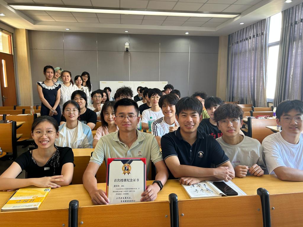为新入职教师薛有松举办首次授课纪念证书颁发仪式,学院党委书记张菁燕亲临课堂为其颁发证书,并予以勉励。