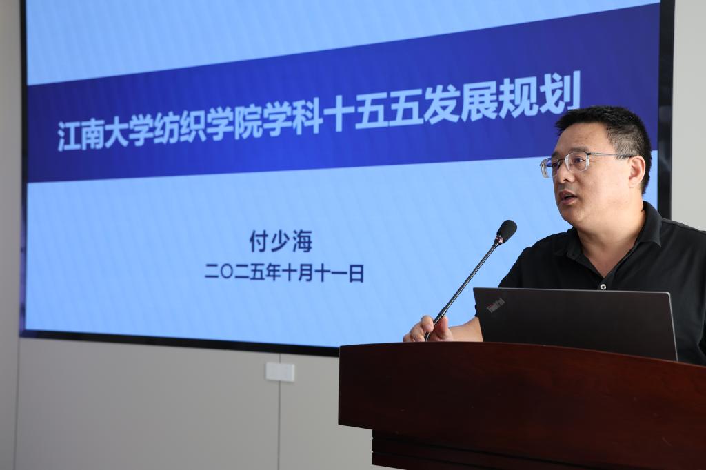 付少海作学院“十五五”规划(2026-2030)起草工作报告。他围绕学院“纺织学科‘十五五’规划”,总结了学院的任期目标完成情况,深入剖析了目前学院在学科平台建设、科研成果、人才引进等方面存在的问题与挑战,并结合“十五五”发展规划背景,提出学院“十五五” 期间的总体发展目标——建成“研究型、国际有影响力、特色鲜明优势凸显”的纺织学科,并从三大维度部署具体举措:一是要围绕国家战略,凝聚学科方向。打造军工特色、智能织造技术、生态加工技术的核心学科方向;二是要坚持四个面向,开展学科研究。以平台为引领,优化科研团队,强化特色建设;三是加强师资队伍建设,优化人才培养机制。注重高水平师资队伍建设,深化高素质人才培养改革,构建“纺织+创新拔尖本科生人才培养体系”与“多维度研究生人才培养模式”,为纺织产业高质量发展输送人才。