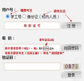 网上缴费平台”,完成缴费。考生账号已开通,切勿自行注册。收费标准:80元/生(仅申请考核考生,硕博连读考生无须缴费)。用户号在“学工号”输入正确的身份证号,初始密码(9位):“BS”+准考证编号后4位+“@fs”(准考证查看网址://yzgmis.sihutv.org/zsgl/bswb/login.aspx),如“BS1234@fs”。非首次登录缴费系统的考生(含往年报考考生及误注册考生)请使用“找回密码”,登录并缴费。