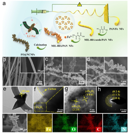 乔辉教授和魏取福教授团队在Advanced Fiber Materials上发表了题为“Growth-Controllable Spindle Chain Heterostructural Anodes Based on MIL-88A for Enhanced Lithium/Sodium Storage”的研究进展。研究者通过静电纺丝技术和种子介导生长策略,在水溶液中配位Fe3+和富马酸,构建了一种纺锤链结构金属有机框架(MIL-88A)自牺牲模板,这是一种环境友好的合成路径。研究结果表明,种子介导生长策略可以将成核和生长阶段相分离,从而更好地控制MIL-88A的形状演变,提升面质量负载量。得益于其杂原子掺杂导电网络、多孔结构和多组分协同效应,纺锤链结构Fe2O3@N掺杂碳纳米纤维(FO@NCNFs)应用于锂离子电池和钠离子电池显示出良好的倍率性能和长循环稳定性。