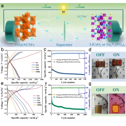 此外,制备的全电池FO@NCNFs-6//LiCoO2和FO@NCNFs-6//Na3V2(PO4)3可至少点亮45个LED灯泡组成的灯牌,显示出实际应用前景。因此,这种从纳米尺度到宏观尺度调控的纺锤链结构,将为高能密度与功率密度纤维电极材料的制备及其在下一代可充电电池中的应用提供新的视角。