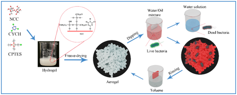 论文将卤胺化合物改性的纳米晶体纤维素与硅氧烷复合,制备了用于油水分离以及抗菌的纤维素气凝胶。该气凝胶具有多孔、三维网状微观结构,硅氧烷赋予的疏水性能有效地去除含油污水中有机污染物,同时,能够有效杀灭和抑制水中细菌,具有优异的油水分离以及杀菌效果。该纤维素气凝胶材料具有优异的可重复使用性,是一种可降解可再生材料,对于制备污水处理材料具有重要的意义。