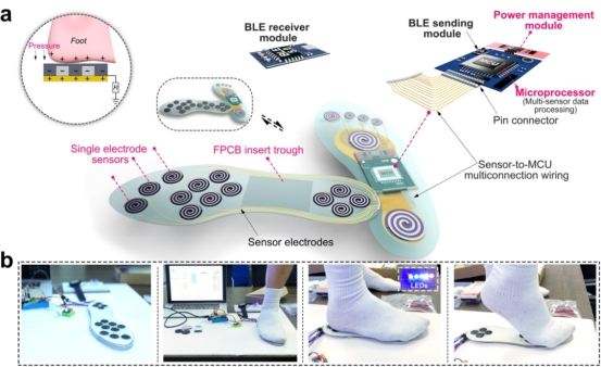 图3(a)集成智能鞋垫系统完整组件(b)TENG鞋垫上产生的电能让LED发光