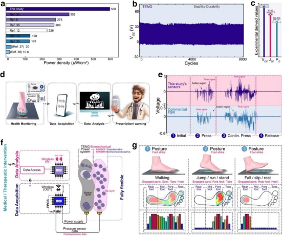 图4为TENG传感器系统用于分析足部与传感器接触状态,包括脚底、脚趾、脚跟、脚弓、中脚、前脚掌区域的接触情况与压力分布,以及足部压力信号采集、模拟和系统集成,彰显了其在实际应用中的价值,也预示着它在市场中具有较大的发展潜力。