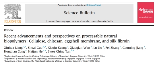 针织技术教育部工程研究中心蒋高明教授团队在综合性国际期刊《Science Bulletin》(IF=18.8)上发表题为“Recent advancements and perspectives on processable natural biopolymers: cellulose, chitosan, eggshell membrane, and silk fibroin”的综述论文。四虎