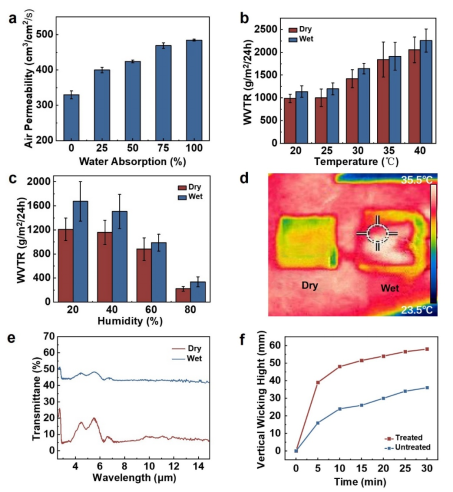 图4. 基于透气性、透湿性和红外透射效果的超百叶织物的热湿管理性能分析。