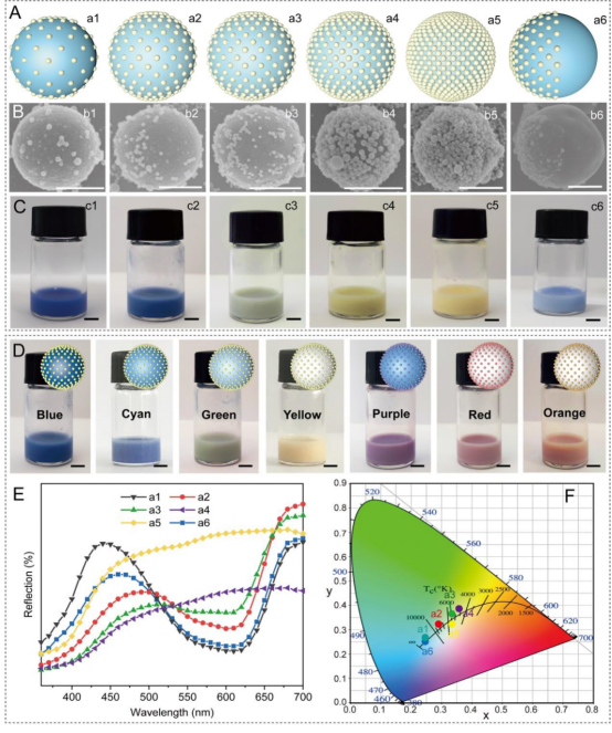本研究提出的基于双室复合微胶囊的动态变色技术,不仅为防伪技术的发展提供了新的思路,还为信息加密和智能材料领域开辟了广泛的应用前景。通过目前的设计,实现了全色域色谱的动态调控。进一步调节微胶囊表面的纳米胶囊数量和分布,从而进一步扩展颜色的动态调控变化。